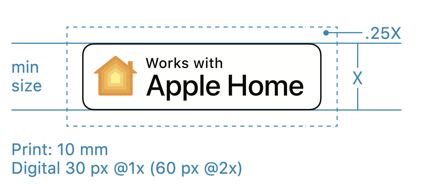 The minimum height for a Works with Apple Home badge is 10 mm on printed communications and 30 pixels for onscreen use. The minimum clear space around the badge is equal to one-quarter the height of the badge. Don’t place graphics, type, photographs, or illustrations inside the clear space area.