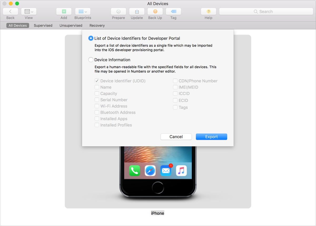 选择“List of Device Identifiers for Developer Portal”(用于开发者门户的设备标识符列表),然后点按“Export”(导出)。