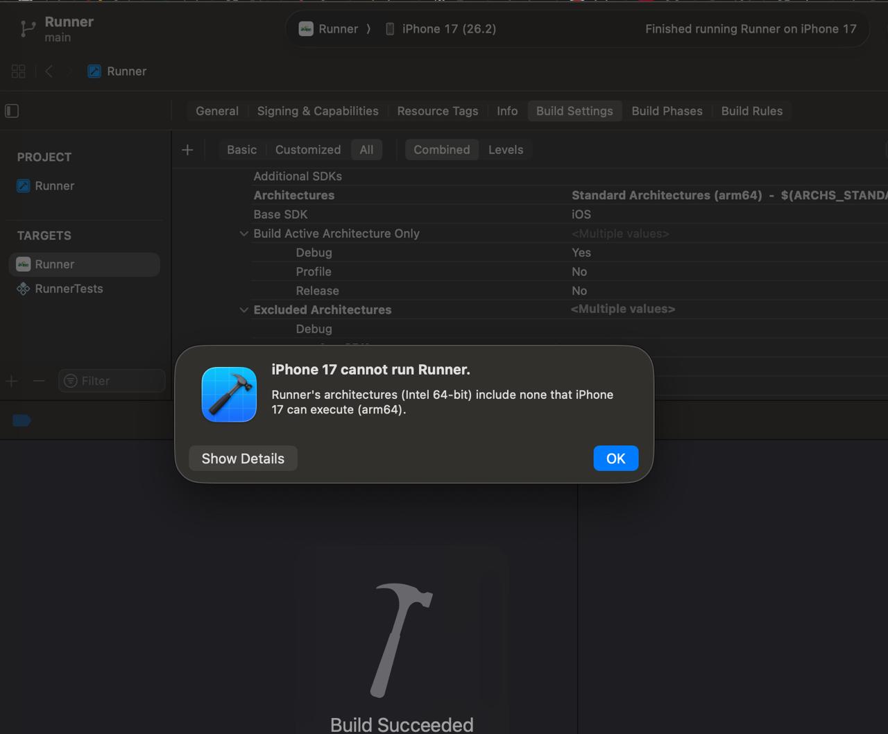 My project is complete, I successfully compile the application, but when I try to run it on my simulator it gives an error, stating that the architecture is incorrect, even though it is parameterized for ARM architecture.