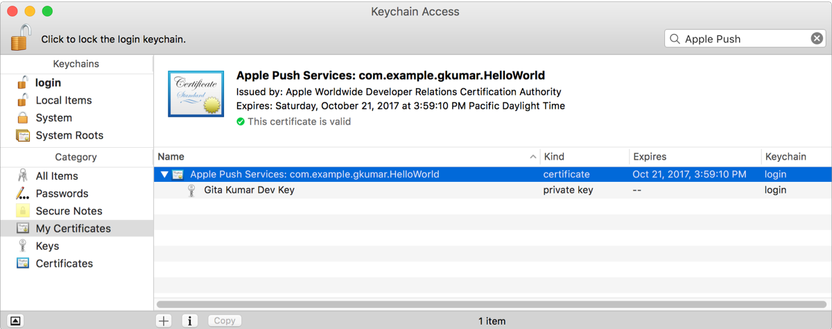 To install the certificate in your keychain, double-click the downloaded certificate file on your Mac. The certificate appears in the My Certificates category in Keychain Access.