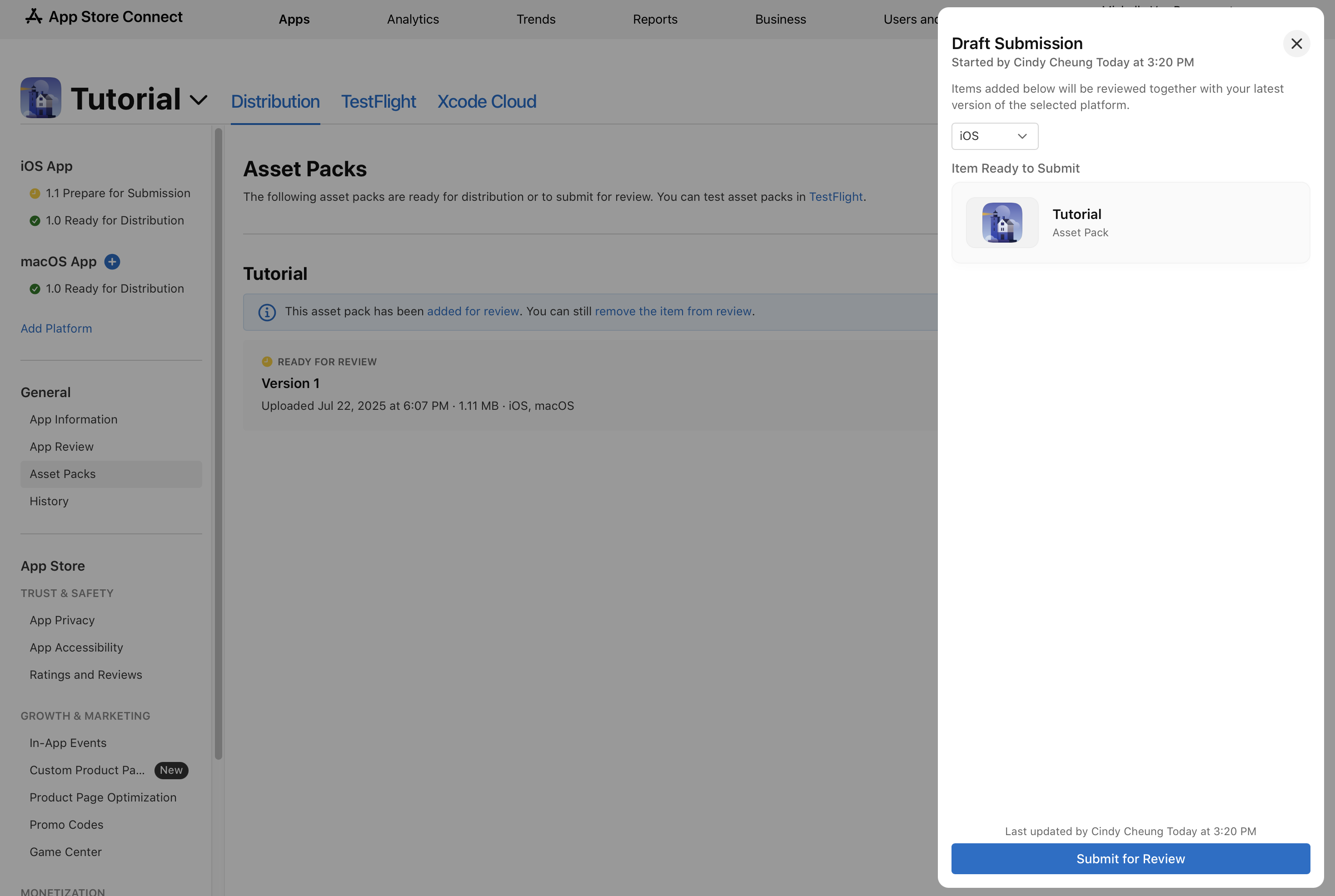 Asset packs must be reviewed before they can be tested externally in TestFlight or made available for users on the App Store. Learn about submitting asset packs for external testing.