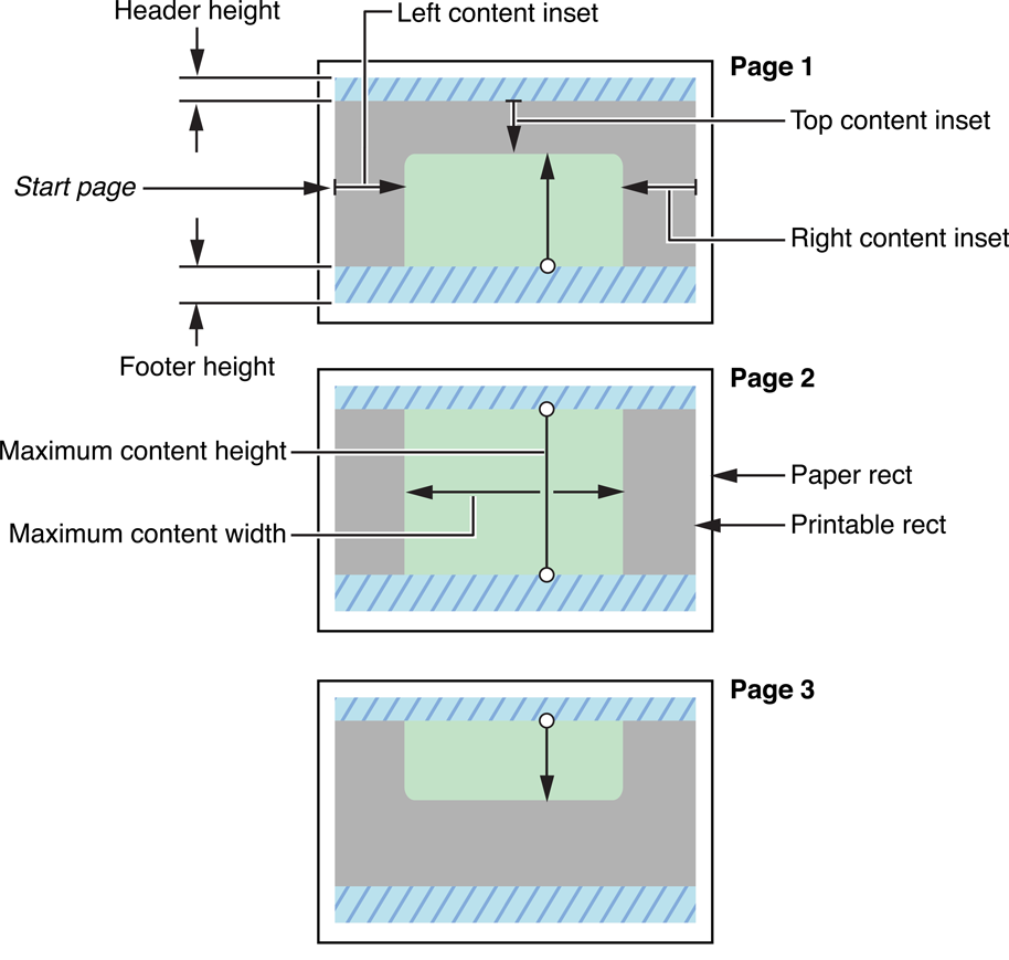 A page renderer can draw printable content in conjunction with one or more print formatters. For example, an app can use a UISimpleTextPrintFormatter object to draw pages of textual content for printing, but use a page renderer to draw a document title in each page header. Or an app can use two print formatters, one to draw header (or summary) information at the beginning of the first page and another print formatter to draw the remaining content; then it might use a page renderer to draw a line separating the two parts.