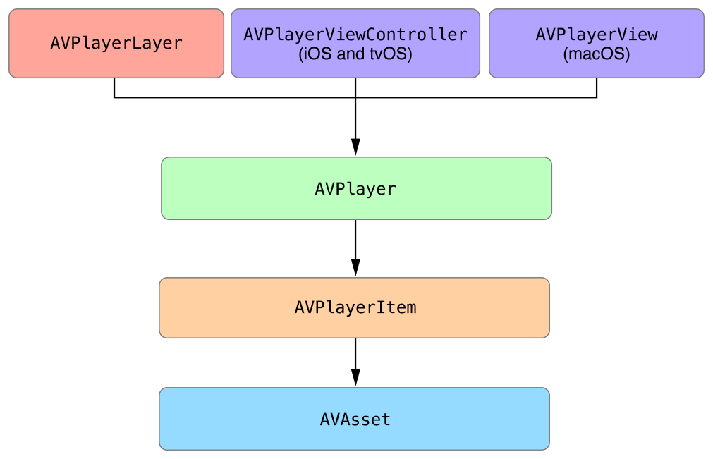 AVPlayerViewControllerin iOS or tvOS, orAVPlayerViewin macOS. These objects present the video content, along with playback controls and other media features, giving you a full-featured playback experience.AVPlayerLayer. If you’re building a custom interface for your player, you’ll use a