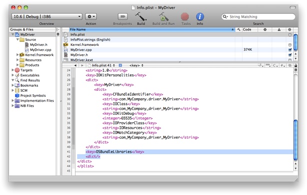 A device driver’s Info.plist file is in XML format. Whenever possible, you should view and edit the file from within Xcode or within the Property List Editor application. In this way, you help ensure that you don’t add elements (such as comments) that cannot be parsed by the kernel during early boot.