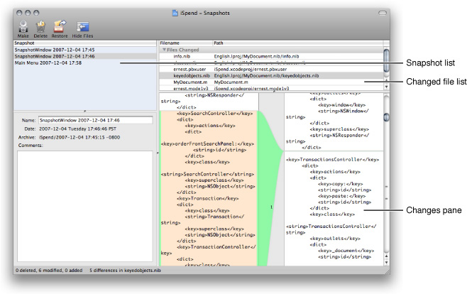 When you select a snapshot in the Snapshot window, the changed file list shows the differences between the snapshot and the current state of the project. That is, Xcode compares the snapshot against the project.