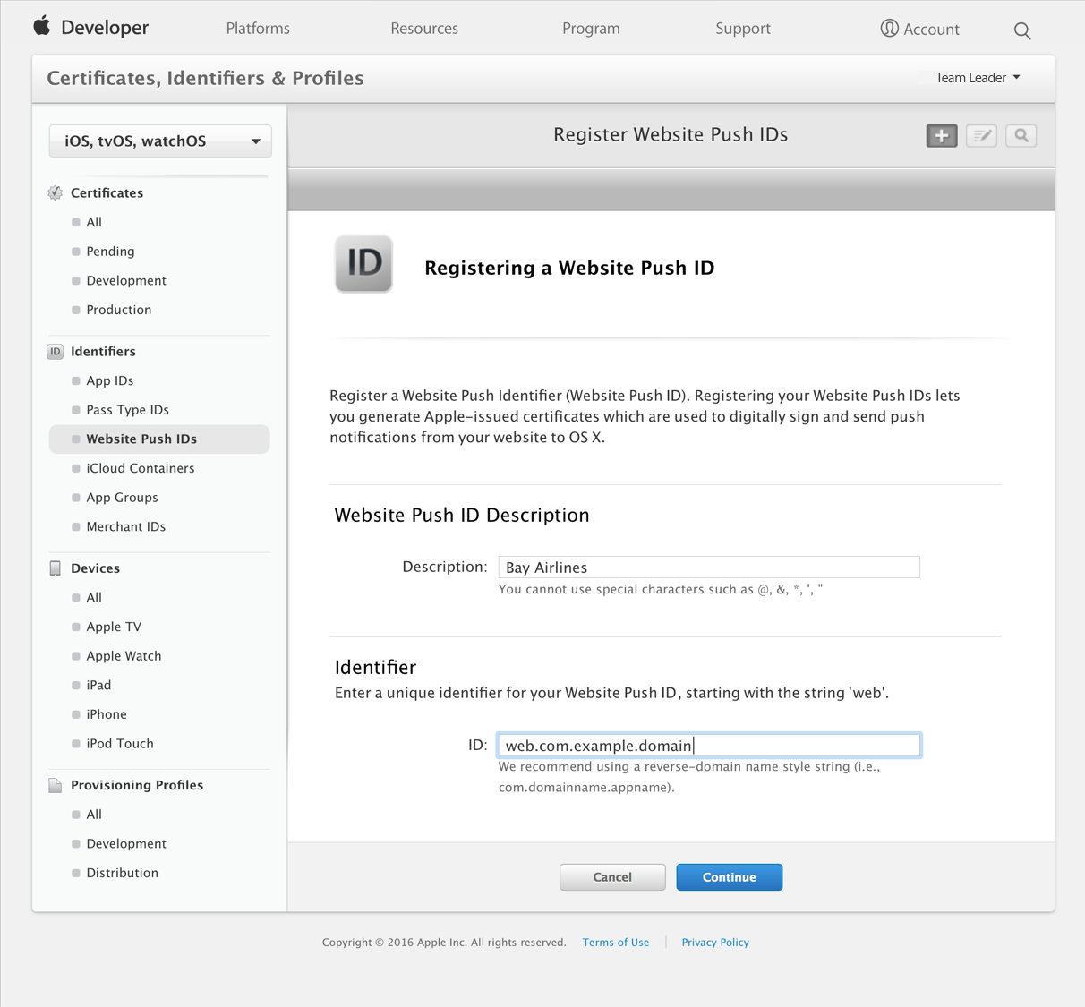 web.com.example.domain(the string must start withweb.). This is also known as the Website Push ID.Website Push ID Description. This is the name used throughout the Provisioning Portal to refer to your website. Use it for your own benefit to label your Website Push IDs into a more human-readable format.