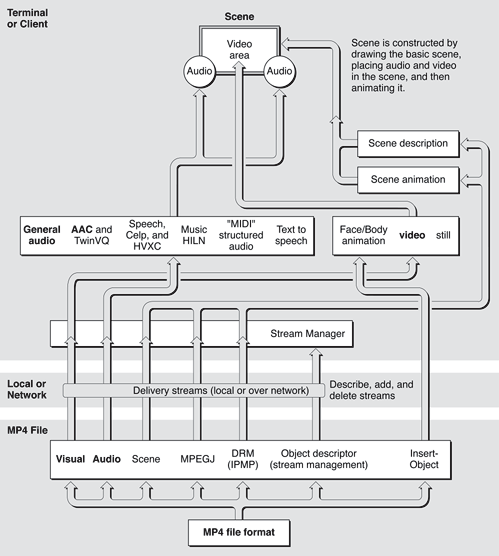 Support for ISO-compliant MPEG-4 video and audio, both encode and decode. Developers, authors, and multimedia producers can now create and play back MPEG-4 video content, as well as MPEG-4 audio encoded using Advanced Audio Coding (AAC). Discussed in the section Support for MPEG-4.