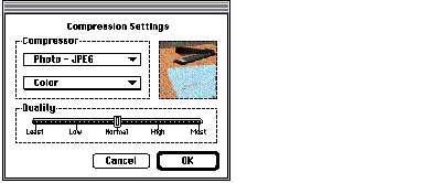 Standard image compression dialog components support two basic dialog boxes. One dialog box provides a minimal interface and is suitable for compressing single images. Figure 13-1 shows an example of this dialog box. Using this dialog box, the user can select a compressor component, the pixel depth for the operation, and the desired spatial quality.