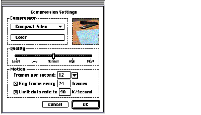 By using a standard image compression dialog component, you can reduce the amount of work you need to do in your application in order to compress an image or an image sequence. For example, you can eliminate the need to manage interactions with the user and to validate the image compression parameters specified by the user. Furthermore, the standard dialog component simplifies the process of compressing images or sequences. This, in turn, allows you to focus on the problem at hand, rather than on the details of image compression parameters. In addition, the standard image compression dialog component supplied by Apple supports many features that are helpful to the user, including Balloon Help and a test image. Finally, Apple’s component will be localized by Apple, so that you need not worry about international issues relating to this dialog box.