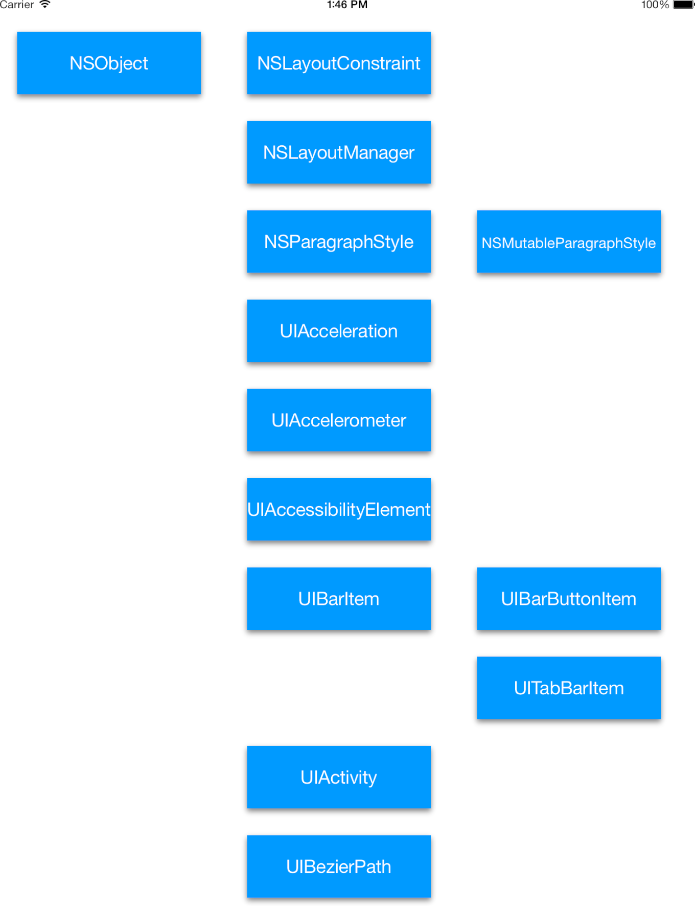 The purpose of this worked example is to implement a custom layout for displaying a hierarchichal tree of information such as the diagram seen in Figure 6-1. The example provides snippets of code followed by an explanation of the code, along with the point in the customization process you have reached. Each section of the collection view constitutes one level of depth into the tree: Section 0 contains only the NSObject cell. Section 1 contains all of the children cell’s of NSObject. Section 2 contains all of the children cells of those children, and so on. Each of the cells is a custom cell, with a label for the associated class name, and the connections between cells are supplementary views. Because the connector view class must determine how many connections to draw, it needs access to the data in our data source. It therefore makes sense to implement these connections as supplementary views and not decoration views.