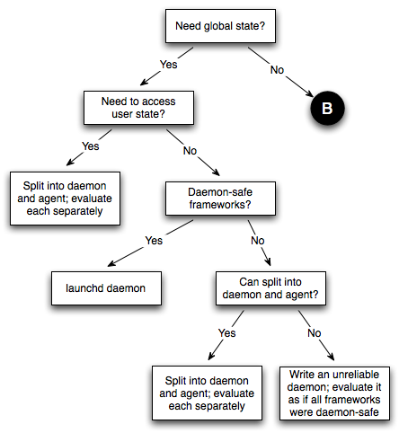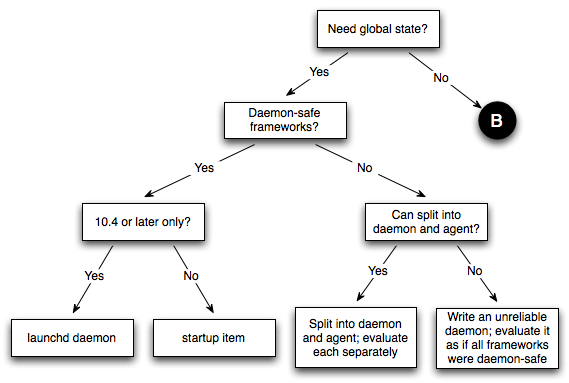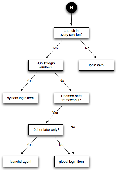 Prior to Mac OS X 10.5, launchd was significantly less powerful than it is today. Thus, a number of the techniques shown in the figures in Getting Launched are not available. If you need to support older systems, you should consult Figure 7 and Figure 8 when deciding on the best approach to launching your program.