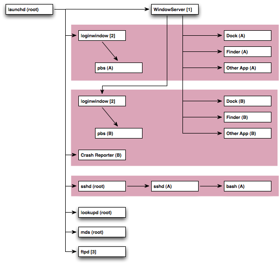 In this diagram there are three per-session bootstrap namespaces, two for GUI login sessions (users A and B) and one for an SSH login session (user A). These are represented by red boxes. Items that aren't in any red box are in the global bootstrap namespace.